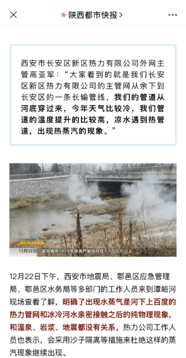 2023年12月以来,一条“西安市鄠邑区地下涌出热水”的信息频繁在网络上传播,伴随该条信息,互联网涌现出各式各样的谣言,如“地下出热水是因为发生了地震”、“是因为地下热管道破裂”......