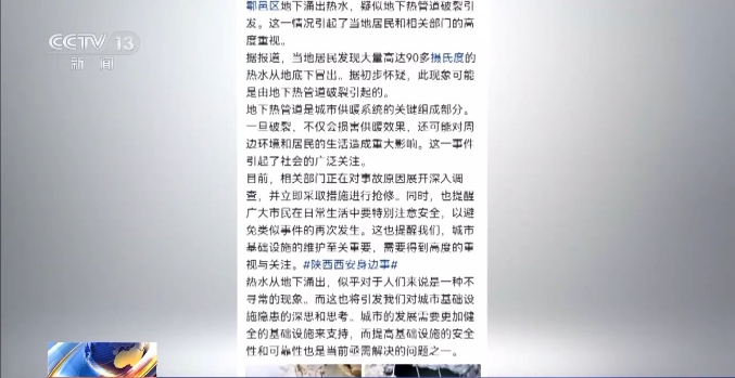 西安市公安局鄠邑分局网安大队副大队长 张羽林:经过调查,这是长安新区热力公司的一条热力管道。经过潭峪河,热力管道的工作人员也进行了现场调查,管道也没有破裂,也没有出现热水外泄的情况。