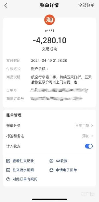 据阿良提供给记者的交易记录显示,在二手交易平台上,卖家的商品说明为:航空行李箱二手,持续五天打折,五天后恢复原价可以上门自提。卖家和博主的交易金额为4280.10元,商品从江苏常州发出,在河北唐山签收。