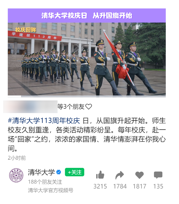 清华大学表示:“清华大学113周年校庆日,从国旗升起开始。师生校友久别重逢,各类活动精彩纷呈。每年校庆,赴一场‘回家’之约,浓浓的家国情、清华情澎湃在你我心间。”