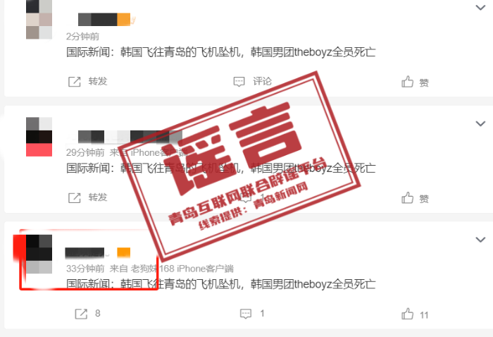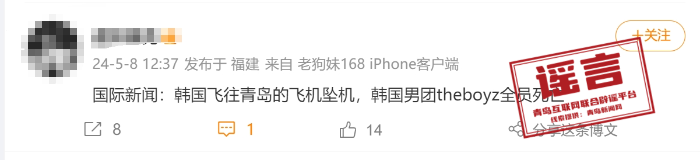 5月8日中午,3名微博用户先后发帖称:“韩国飞往青岛的飞机坠机,韩国某男团全员身亡。”据微博页面显示,这些用户发帖IP来自福建、浙江等地。
