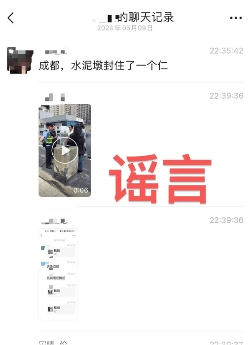 5月10日晚,记者从成都市公安局了解到:2024年5月9日晚,网传“成都,水泥墩封住了一个仁(人)”的不实信息,公安机关于5月10日13时依法将涉嫌散布谣言的陈某(男,成都市人,47岁)传唤到案。
