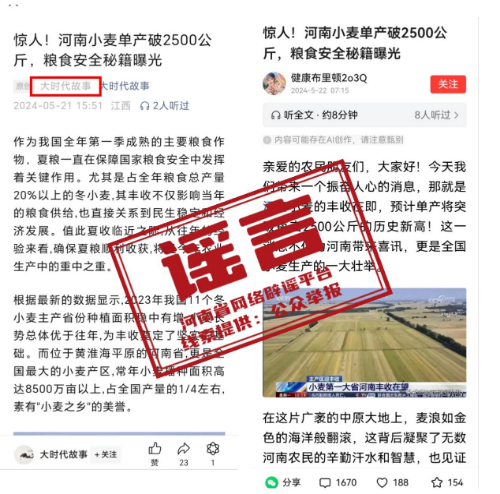 5月21日,微信公众号“大时代故事”发文称“惊人!河南小麦单产破2500公斤,粮食安全秘籍曝光”。随后,网络平台用户“村庄全记录”“毒针挑毒刺”“芮芮说说”“健康布里顿2o3Q”“郑州游玩攻略”等多个账号转发评论相关信息。