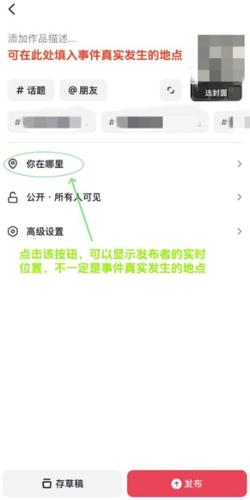 以抖音平台为例。在用户上传视频信息时,页面会显示“作品描述”和“你在哪里”等内容框供用户填写。如果作者发布的视频并非当下所作,可在“作品描述”中写清事件发生的真实时间地点等。如果用户没有在“作品描述”中写明,而只选择“显示位置”,就会让人误以为用户发布的视频是在显示的位置上所发生,容易引起误会,甚至引发谣言。