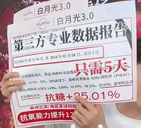 主播声称的抗氧、抗糖功效均指向抗衰老功能。记者仔细查看了主播晒出的“第三方专业数据报告”,发现当试验原料浓度在50%的情况下,晚期糖基化终末产物的抑制率(AGEs)才能达到25.01%。同时,该产品备案功效仅为“保湿、舒缓”。此外,《化妆品分类规则和分类目录》规定的26类功效中也没有抗氧抗糖功效。
