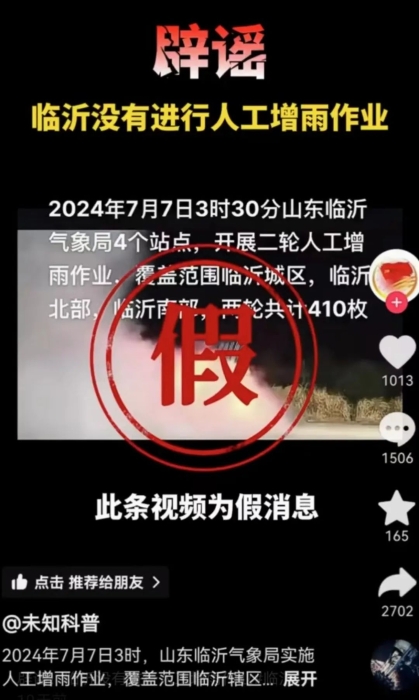 7月8日,郯城县公安局在工作中发现一网民在某短视频平台发布“2024年7月7日3时30分山东临沂气象局4个站点,开展二轮人工增雨作业,覆盖范围临沂城区、临沂北部、临沂南部,两轮共计410枚”的不实信息。
