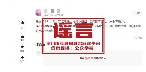 7月11日,有网民在网络平台发文称,近期非洲猪瘟大爆发,养殖场散养户90%的猪都死了,荆门市场有很多商户贩卖感染猪瘟的死猪。据市农业农村局核实,该网民反映的情况不属实。今年上半年农业农村部门对全市生猪养殖场户开展了多次全覆盖排查,没有发现生猪大量死亡情况,也未接到非洲猪瘟疫情报告。同时,市兽医实验室共计监测组织样品、血样和双拭子环境样品1518份,未发现异常情况。