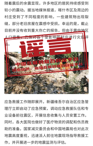 真相:近日,有网民发布帖文称“新疆喀什市7月22日发生6.3级地震,周边村庄建筑出现裂痕,部分老旧房屋在震感中受损……”。经新疆喀什市应急管理局证实,当日喀什市域内未发生地震,中国地震台网也未发布喀什当日发生地震的相关信息,此信息为虚假内容。(来源:网信新疆、新疆喀什网络举报)