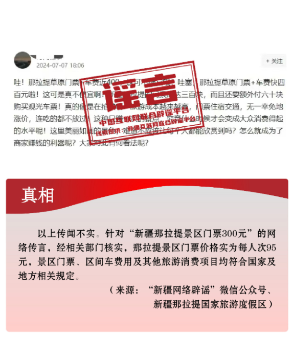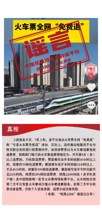 杜撰民生政策,企图行骗牟利。7月,冒充官方发布虚假政策信息、假冒权威机构名义开展非法活动的情况时有出现。例如,一些不法分子冒用广西南宁市住建局名义,发布所谓“南宁将发放住房公益补贴”的通知,实则是打着“发放补贴”的旗号设置骗局;有网民借“募集捐款20亿元医治2万名西藏盲童”之名,成立“慈善团队”筹集资金行骗。与此同时,随着暑期旅游高峰到来,关于“抢购车票”“景区票价”等话题热度攀升,涉旅游出行等不实信息借机搭蹭热点,滋生扩散,扰乱旅游市场秩序。如“火车票全网免费退”“专享火车票无忧退”等消息,实则是某购票平台为吸引新会员的营销炒作之举;谣言“新疆那拉提景区门票300元”“新疆江布拉克景区门票453元”或有意混淆景区门票与区间车费,或罔顾事实故意抹黑,误导广大游客,损害当地旅游形象。