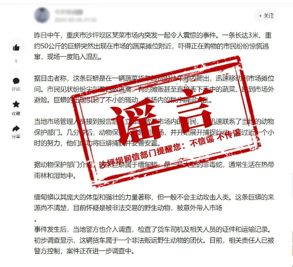 2024年8月6日,有网民在网络平台发布帖文,称“昨日中午,重庆市沙坪坝区某菜市场内,一条长3米、重约50公斤的巨蟒突然出现在蔬菜摊位附近,吓得正在购物的市民纷纷惊慌逃窜,现场一度陷入混乱”。