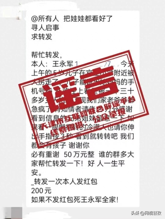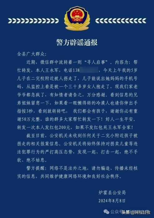 近日,四川甘孜州炉霍县公安局发布通报:近期,微信群中流转着一则“寻人启事”,其内容为“帮忙转发,本人王永军,电话138××××××××,今天上午我的5岁儿子在二完校附近被人拐走了,儿子能说出她妈妈的手机号码,从监控上看是被一个三十多岁女人抱走了,现我们家老爷爷都急疯了,有知情者请告之,万分感谢。看到信息的兄弟姐妹留意一下,如果看一眼懒得转的冷漠人也请你伸出手指按3秒,看到就转转吧……”