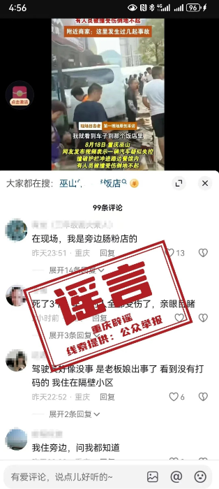 近日,网传重庆市巫山县发生一起车祸,某网民在评论区称"死了3个",引发关注。经核实,该条评论为谣言。