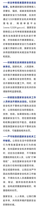 详情:近年来,国家安全机关在人民群众支持配合下,有力开展各项工作,坚决维护国家主权、安全、发展利益。《中华人民共和国反间谍法》和《国家安全机关行政执法程序规定》、《国家安全机关办理刑事案件程序规定》等法律法规规章为人民群众配合协助开展国家安全机关工作、共同维护国家安全提供了法律依据。(来源:“国家安全部”微信公众号)