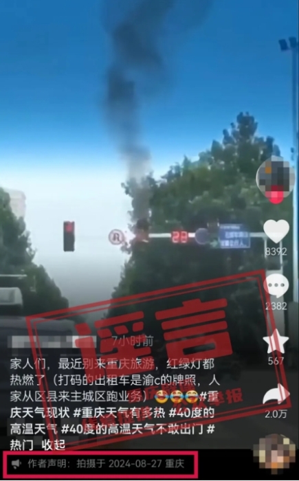 8月27日,某网民发布视频并配文“最近别来重庆旅游,红绿灯都热燃了”,引发关注。经核实,重庆近期未发生此类事件,网传信息系谣言。