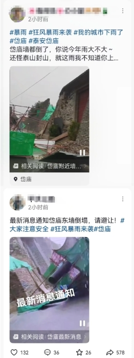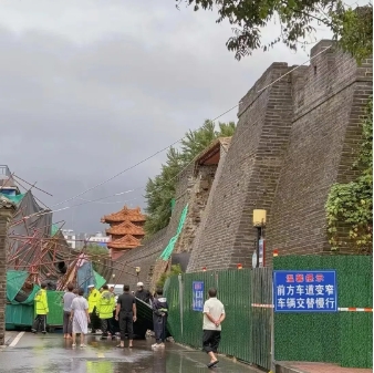 事发现场位于仰圣街的岱庙东华门南侧。“不是城墙倒了,是这面墙施工扎的架子刮倒了。”现场一名施工人员介绍,下午4点左右,因强降雨及强对流天气原因,一阵风把东华门南侧施工脚手架刮倒了,现场无人员伤亡。