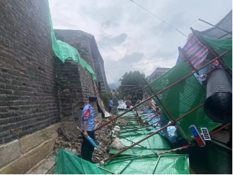 8月26日下午,有市民发布关于“泰安岱庙外墙被刮倒”的图片及视频。现场施工人员告诉记者,并非墙塌,是东华门南侧的墙体近期正在维修,当天因大风,导致脚手架被刮倒。