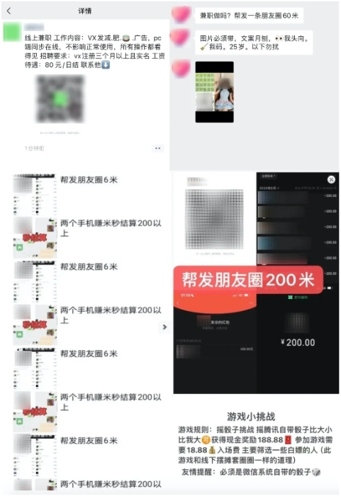 根据用户投诉发现,近期有不法分子以“兼职”为幌子,在朋友圈、微信群发布“帮发朋友圈换米”“闲置小号换零花钱”等相关内容。提醒大家切勿参与!这些不法分子可能会指派你发布含有无资质产品的广告内容(如虚假减肥产品宣传)、招嫖类不良信息、欺诈引流类内容(如宣称刷单可获双倍返现)等。