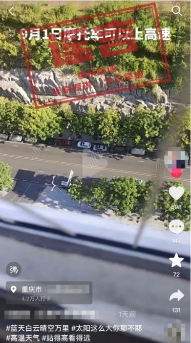 近日,某网民发布视频并称“9月1日摩托车可上重庆高速公路”,引发关注。经核实,重庆禁止摩托车在高速公路和城市快速道路上行驶,网传信息系谣言。