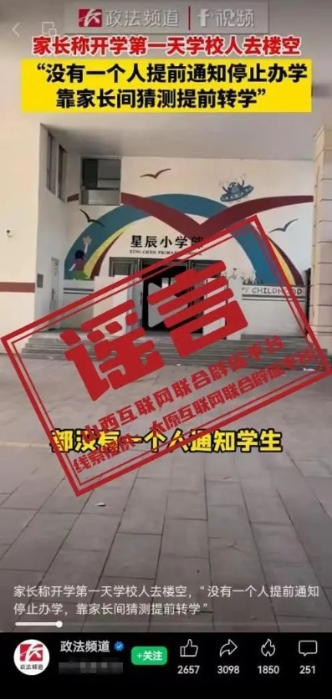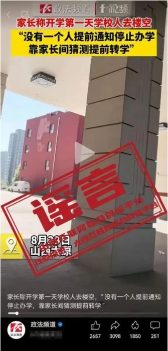 8月30日11时27分,抖音账号“政法频道”发布短视频称,8月29日,山西太原,家长称开学第一天学校人去楼空,“没有一个人提前通知停止办学,靠家长间猜测提前转学”。