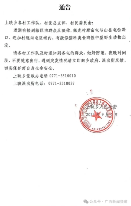 9月2日,广西崇左市天等县上映乡政府发布通告称,近期接到辖区群众反映,有疑似猫科类食肉性中型野生动物出没,提醒各村屯群众做好防范。