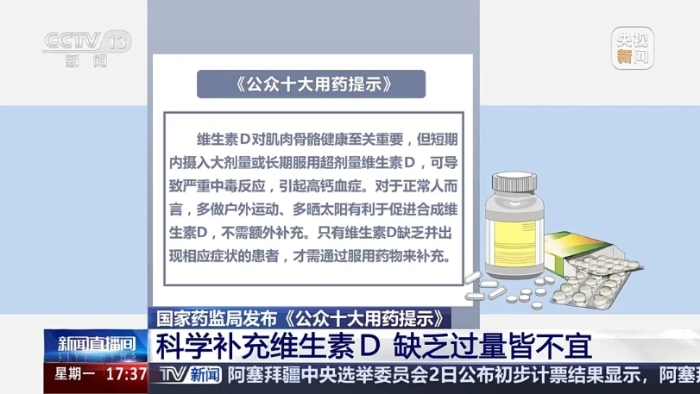 维生素D对肌肉骨骼健康至关重要,但短期内摄入大剂量或长期服用超剂量维生素D,可导致严重中毒反应,引起高钙血症。对于正常人而言,多做户外运动、多晒太阳有利于促进合成维生素D,不需额外补充。只有维生素D缺乏并出现相应症状的患者,才需通过服用药物来补充。