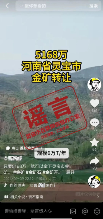 9月11日,河南省灵宝市委网信办接到某某矿业有限公司举报,互联网平台自媒体网民账号曹砖*,发布“5168万河南灵宝金矿转让”的相关信息和视频。经核实,网传灵宝市某某矿业有限公司的有关信息为虚假不实信息!