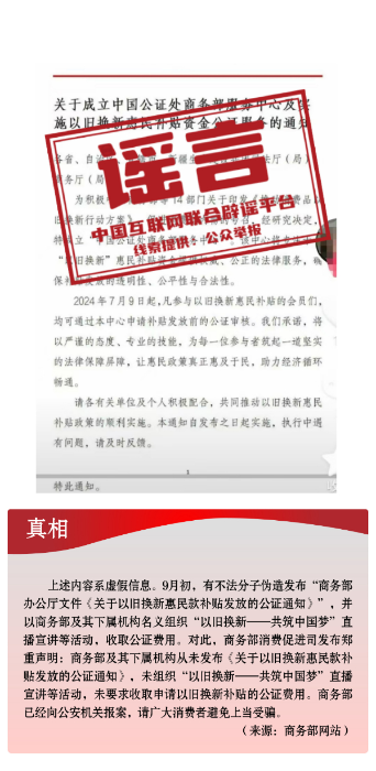 编造公共政策行骗牟利。9月以来,一些不法分子假冒官方名义发布虚假政策信息实施诈骗,损害群众利益。如谣言“商务部发布《关于以旧换新惠民款补贴发放的公证通知》”“云南文旅局发文,前往云南大环线即可享受优惠福利”“中国商飞发布‘购买股权产品赠黄金’‘中国商飞养老金’等投资理财项目”等,均系不法分子假借权威部门和国企名义发布,涉嫌诈骗。谣言“无学历无社保均可入深户”“杭州出台社保新政”则为个别中介机构为揽客引流发布,夸大事实、断章取义,以达到收取代办服务费的目的。另有网传文章称“第六套人民币明年上市,还有1000元面额”,实际系不法分子翻炒陈年旧谣,伪造“新版人民币”票样图片,诱导公众购买所谓“新版人民币测试版藏品”,骗取钱财。