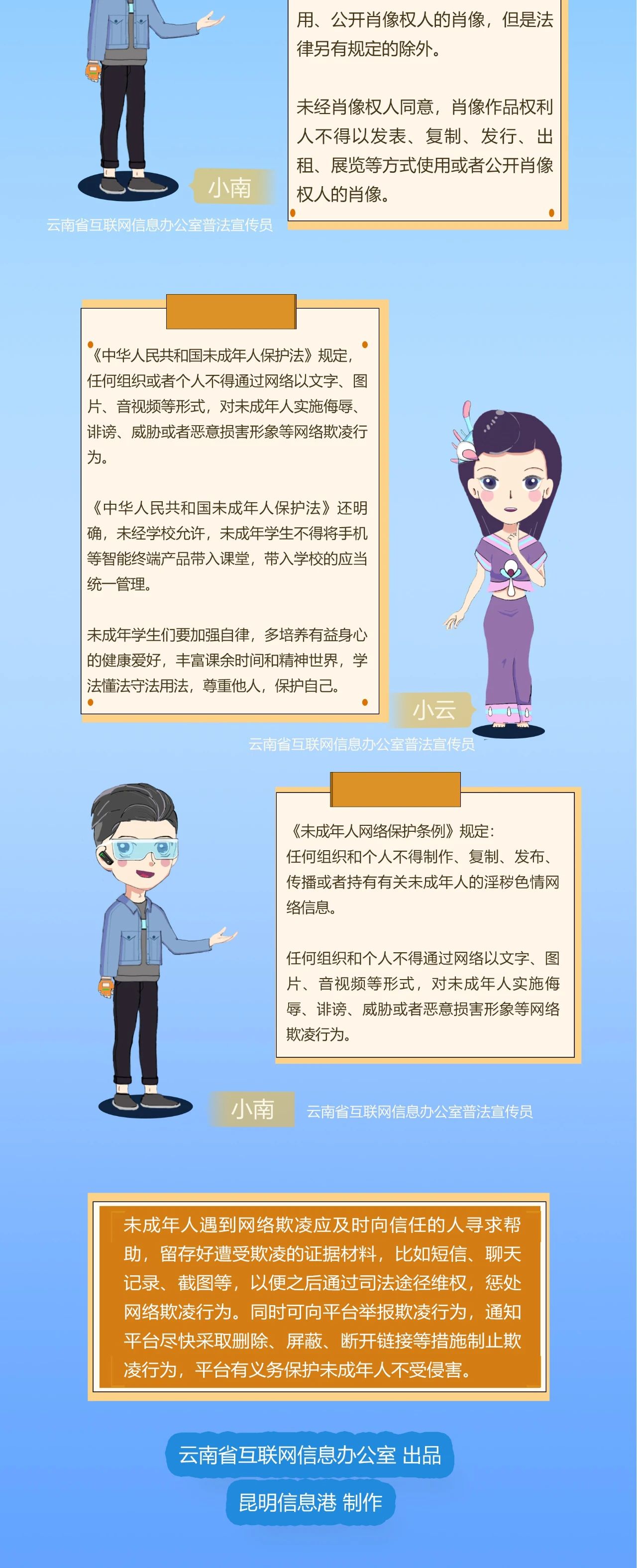 网络法治关系国家安全、社会稳定与人民利益。为增强全民法治意识,营造人人参与普法,全民尊法、学法、守法、用法的浓厚氛围,昆明信息港以《网络安全法》《数据安全法》《个人信息保护法》《未成年人网络保护条例》等法律法规为主,推出了《争做网络法律明白人·云南网络普法漫画》栏目,向公众普及法律知识、提升全民法治意识。