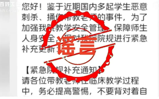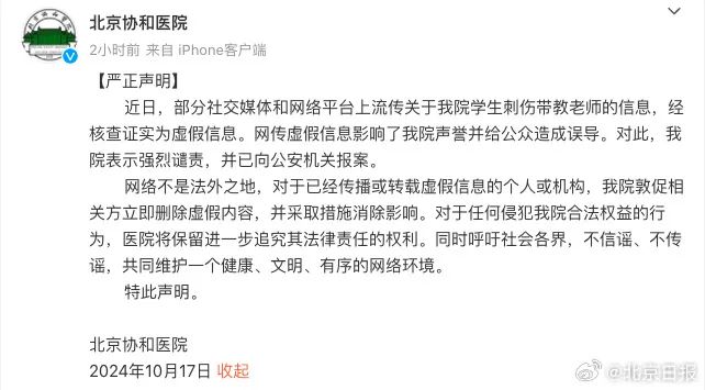 10月17日晚,北京协和医院发布辟谣声明称,近日,部分社交媒体和网络平台上流传关于该院学生刺伤带教老师的信息,经核查证实为虚假信息。网传虚假信息影响了该院声誉并给公众造成误导。对此,该院表示强烈谴责,并已向公安机关报案。