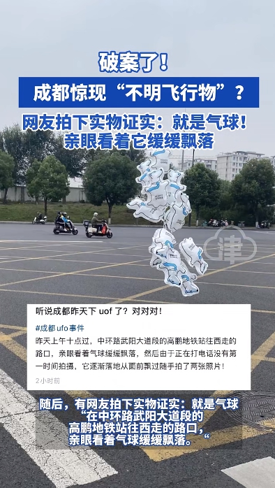 10月29日,有网友发布视频称,在成都市武侯区拍到天空中悬浮的灰色不明飞行物。据目击者称,灰色不规则物体悬浮在半空中,一直打转,看着不像氢气球。视频发布后被网友在线破案:拍下实物证实就是气球,亲眼看着它缓缓飘落。