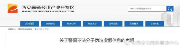 近日,西安高新区住房和城乡建设局发布《关于警惕不法分子伪造虚假信息的声明》,全文如下: