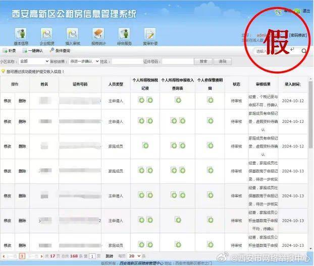 近期接群众举报,发现不法分子伪造西安高新区公租房信息管理信息系统审核界面,在网络上散布公租房资格审核虚假信息。