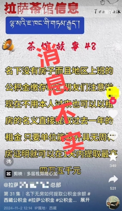 近日,拉萨市住房公积金管理中心发现ID名为“拉萨茶馆房产信息总部”的账号在某平台发布不实信息,内容为:只要缴存单位是拉萨市的职工,不管您名下有没有房子或者单位有没有周转房,都可以在线上提交申请资料,以租房名义在一天内提取到四万五千元,用于江湖救急!在此,拉萨市住房资金管理中心郑重声明:以上内容为不实信息。