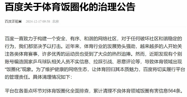 奥运会期间,相关法律部门已经开始着手整治网络“饭圈”行为,各平台和政府部门也对此现象予以高度重视。奥运会乒乓球女单决赛后,微博平台共清理相关违规内容12000余条,并对300余个违规账号予以不同程度处置。8月15日,公安机关网络安全部门公布了4起打击整治涉体育领域“饭圈”违法犯罪典型案例,其中3起涉及乒乓球。