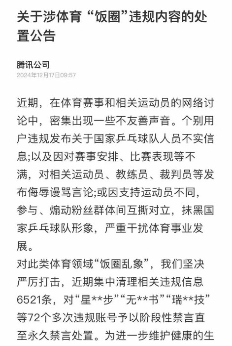 近日,在关于国乒的网络讨论中,个别用户违规发布不实信息,对相关运动员、教练员、裁判员等进行侮辱谩骂,或参与、煽动粉丝群体间互撕对立。