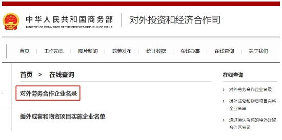对外劳务合作企业的名单已向社会公布,可通过商务部官方网站查询。具体操作是进入“机构设置”里面,选“合作司”,“在线查询”里面有“对外劳务合作企业名录”,点击“企业名单”,即可查看所有合规企业的信息。