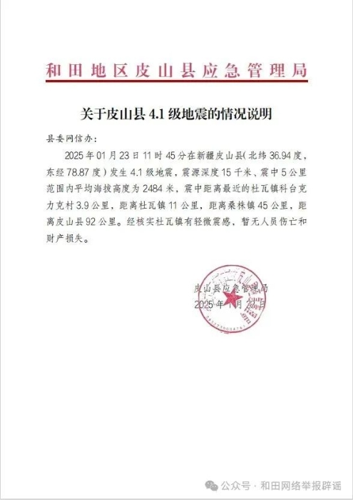 经皮山县应急管理局核实,此次地震未造成人员伤亡及财产损失。