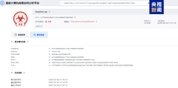 近日,国家计算机病毒应急处理中心和计算机病毒防治技术国家工程实验室依托国家计算机病毒协同分析平台在我国境内捕获发现仿冒DeepSeek官方App的安卓平台手机木马病毒。