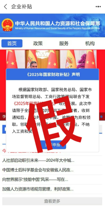 该通知假冒人力资源社会保障部网站,声称:“根据国家财政部和人力资源社会保障部发布通知,针对薪资补贴、社保补贴、医保补贴、住房补贴、交通补贴、岗位补贴等申领认证,申请通过发放五千元相应补贴金”,实则支付宝扫码跳转至假冒人力资源社会保障部网站,骗取个人信息和钱财。