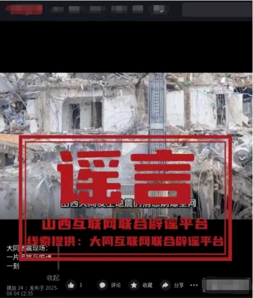 近日,有网民在网络平台发布视频称“大同地震现场:一片废墟与惊魂一刻”。据属地相关部门核实,此次地震未造成人员伤亡和财产损失,网传内容系网络图片和视频拼凑,为不实信息。
