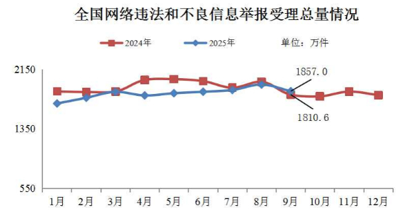 2025年9月,中央网信办举报中心指导全国各级网信举报工作部门、主要网站平台受理网民举报色情、赌博、侵权、谣言等违法和不良信息1857万件,环比下降4.6%、同比增长2.6%。其中,中央网信办举报中心受理举报39.4万件,环比下降7.4%、同比下降1.6%;各地网信举报工作部门受理举报100.8万件,环比增长58.8%、同比下降9%;全国主要网站平台受理举报1716.8万件,环比下降6.7%,同比增长3.4%。