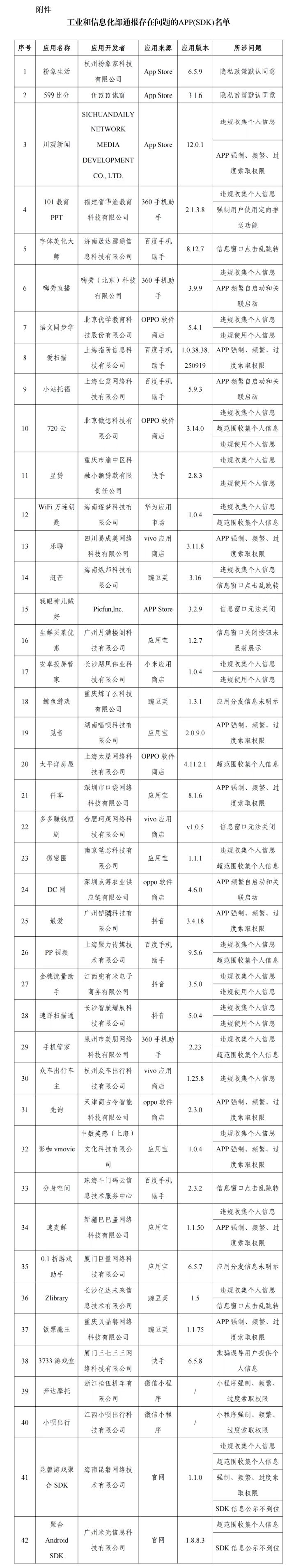 附件:工业和信息化部通报存在问题的APP(SDK)名单