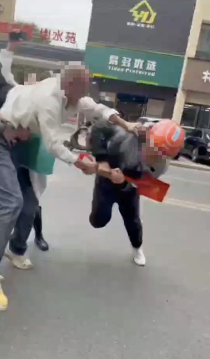 网传视频时长2分19秒,由三段画面拼接而成。内容显示两名外卖员与两名白衣人员(一男一女)发生口角并升级为肢体冲突,视频末尾出现两人躺地、多人围观的场景。