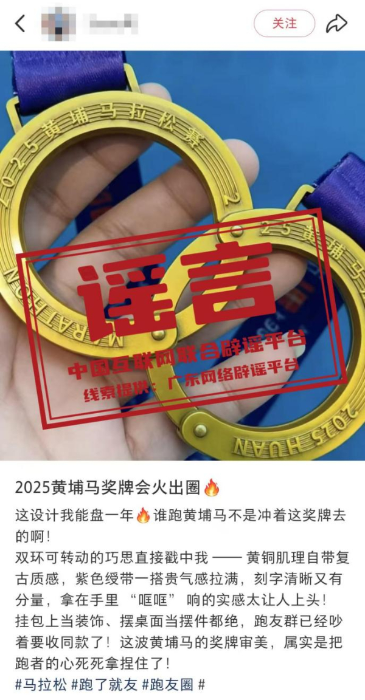 详情:近日,网传“2025黄埔马拉松完赛奖牌为手铐型”消息引发关注。对此,2025黄埔马拉松赛官方组委会回应称该信息不实,网传图片系P图或AI生成。据悉,2025黄埔马拉松完赛奖牌为圆环结构,其设计灵感源于精密齿轮轴承,致敬黄埔深厚的制造业根基。奖牌中央的圆环内圈镌刻的开拓者雕像、科学城地标、知识城九龙湖等图案,在同轴转动时可交替显现,宛如一条缩微的“城市发展能量带”,隐喻着个人拼搏精神与城市前进动力的同频共振,实物并不能如网传图片那样打开并呈现“手铐型”。(来源:“广东省互联网举报中心”微信公众号、南方网)