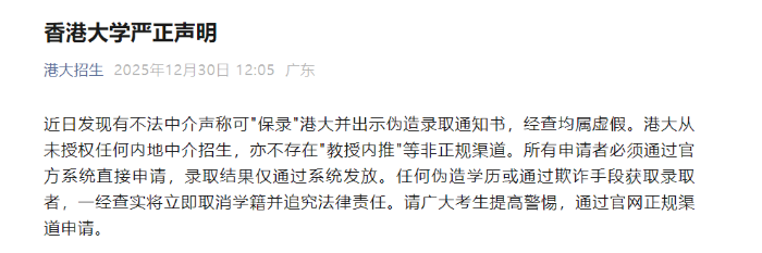 香港大学:有不法中介声称可“保录”港大2025年12月30日,香港大学通过“港大招生”发布严正声明,近日发现有不法中介声称可“保录”港大并出示伪造录取通知书,经查均属虚假。港大从未授权任何内地中介招生,亦不存在“教授内推”等非正规渠道。所有申请者必须通过官方系统直接申请,录取结果仅通过系统发放。任何伪造学历或通过欺诈手段获取录取者,一经查实将立即取消学籍并追究法律责任。