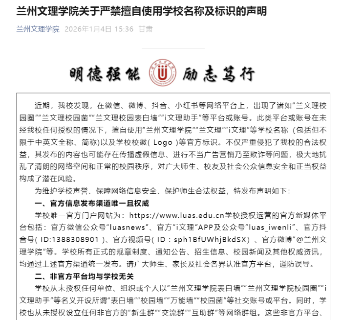 兰州文理学院:网络平台账号擅自使用校名校徽2026年1月4日,兰州文理学院发布声明称,近期,该校发现,在微信、微博、抖音、小红书等网络平台上,出现了诸如“兰文理校园圈”“兰文理校园菌”“兰文理校园表白墙”“i文理助手”等平台或账号。此类平台或账号在未经该校任何授权的情况下,擅自使用“兰州文理学院”“兰文理”“i文理”等学校名称(包括但不限于中英文全称、简称)以及学校校徽(Logo)等官方标识。不仅严重侵犯了该校的合法权益,其发布的内容也可能存在传播虚假信息、进行不当广告营销乃至欺诈等问题,极大地扰乱了清朗的网络空间和正常的校园秩序,对广大师生、校友及社会公众信息安全和正当权益构成了潜在风险。