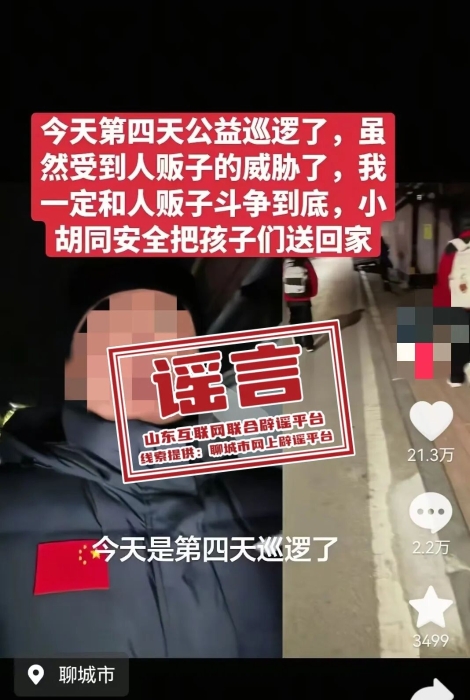 经调查发现,该信息为谣言信息。网民王某借助当前热度较高的公益巡逻行动,捏造“被人贩子威胁”的不实信息,以此实现吸引眼球,博取流量的目的。其粉丝数量在短期内从几千涨至数万,部分视频获赞二十余万次,不实视频造成大量网民浏览、关注,引发当地居民恐慌,造成严重不良社会影响。