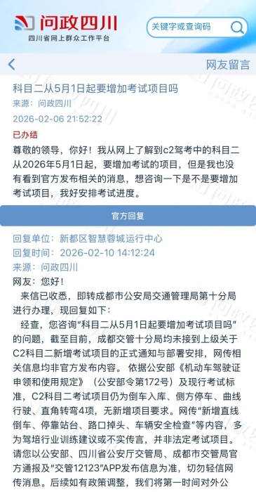 近日,有网友通过“四川省网上群众工作平台—问政四川”反映,网上传言C2驾考中的科目二从2026年5月1日起会增加考试项目,但未看到官方发布权威消息,咨询是否会增加考试项目。