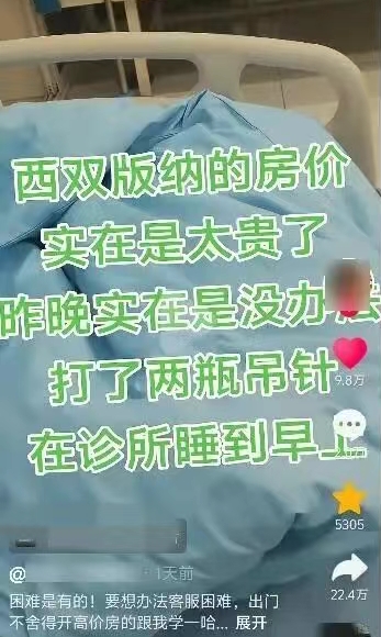 “困难是有的!要想办法克服困难,出门不舍得开高价房的,跟我学一下!”2月20日,一位网民在社交平台发视频称,西双版纳的房价太贵了,前一晚(19日)实在没办法去打了两瓶吊针,在诊所睡到了早上。视频中还附有给诊所的付款截图。该视频引发关注,两天时间获近10万点赞,20余万次转发。