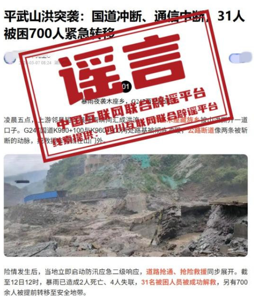 详情:近日,有网民在网络平台发布“平武山洪突袭:国道冲断、通信中断,31人被困700人紧急转移”相关信息,称平武县木座藏族乡发生山洪,G247国道两处路基被冲毁,引发关注。经四川省绵阳市平武县木座藏族乡人民政府核实,近期当地未发生山洪灾害。相关内容实为2022年7月12日木座藏族乡特大山洪灾害的旧闻报道,并非近期发生灾害。发帖人移花接木、断章取义,误导公众。(来源:四川互联网举报辟谣平台)
